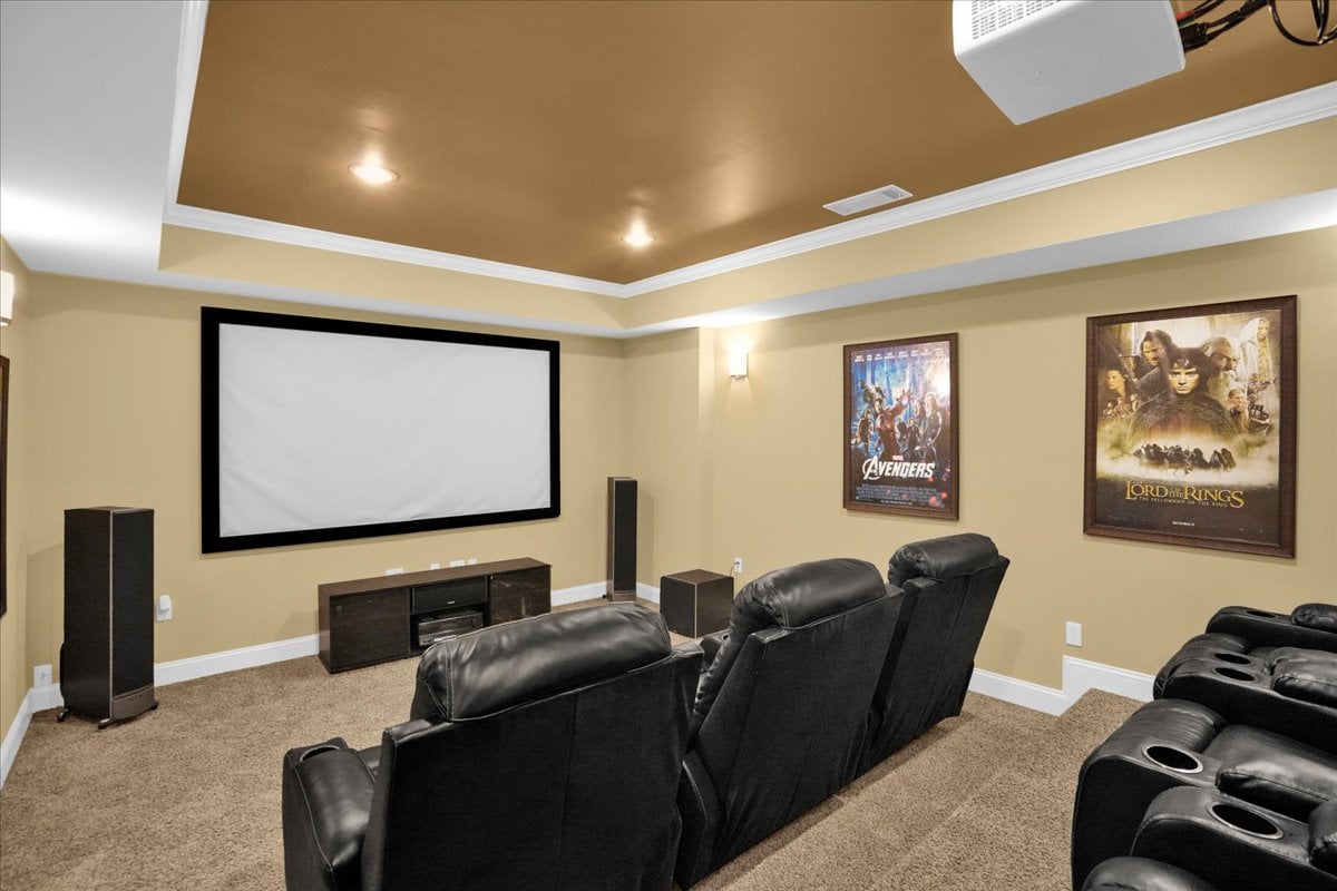 Evenings land in the theater room. The big screen goes on, lights go low, popcorn bowls make the rounds. It is an easy way to gather after a full day.