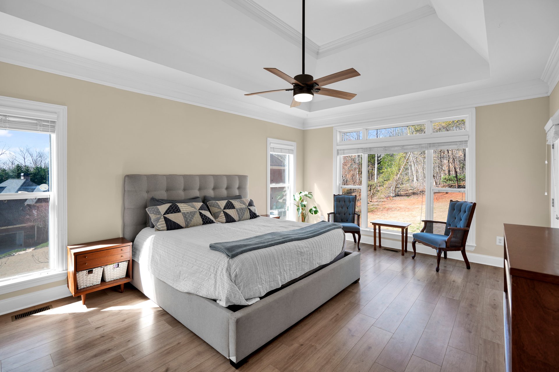 Morning starts quietly in the main-level primary suite. Sunlight pours through the windows, filling the room with warmth. You step into the en suite bathroom where two showerheads and a frameless glass shower door create a spa-like start to the day. A large freestanding soaking tub sits ready for slower evenings, while the generous walk-in closet offers space and order. The primary suite feels calm, bright, and private, with direct access to the back deck just steps away.