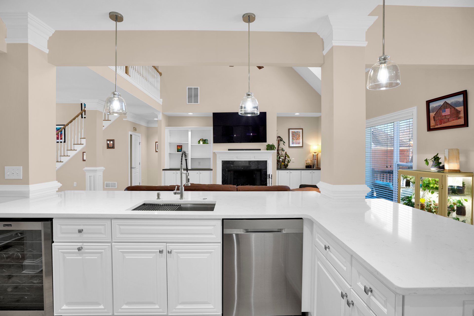 From there, the day moves easily into the kitchen. Under-cabinet lighting adds a soft glow as coffee brews. The walk-in pantry keeps everything organized and tucked away. Vaulted ceilings overhead and built-ins flanking the wood-burning fireplace give the main living area character and comfort. The mantle anchors the room, making it a natural gathering place.