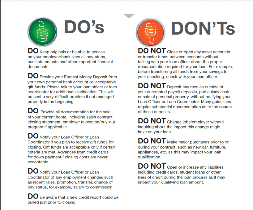 You want your home purchase to go as smoothly as possible. Remember, before you make any large purchases, move your money around, or make major life changes, be sure to consult your lender – someone who’s qualified to explain how your financial decisions may impact your home loan.